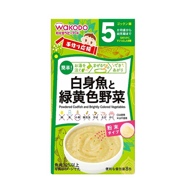 Bột ăn dặm Wakodo vị cá tuyết, rau củ cho bé từ 5 tháng tuổi 18.4g được nghiên cứu và sản xuất theo công nghệ hiện đại của Nhật Bản. Sản phẩm hỗ trợ bé phát triển khỏe mạnh cả về thể chất và trí tuệ. Bột có thành phần chủ yếu là bột gạo Koshihikari, chứa lượng tinh bột rất thích hợp cho độ tuổi ăn dặm, khi bé chuyển từ thức ăn dạng lỏng sang dạng đặc.
