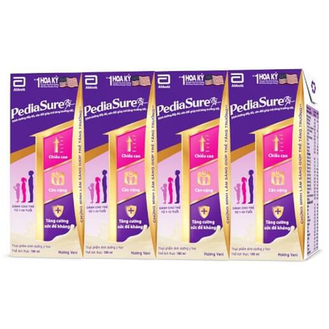 Sữa pha sẵn Pediasure hương vani 180ml (lốc 4 hộp) là dòng sữa chuyên dùng cho bé biếng ăn, thấp còi do thiếu hụt dinh dưỡng. Với thành phần dinh dưỡng cao và hệ chất béo dễ hấp thu, giúp bé bù đắp thiếu hụt dinh dưỡng và bắt kịp đà tăng trưởng.