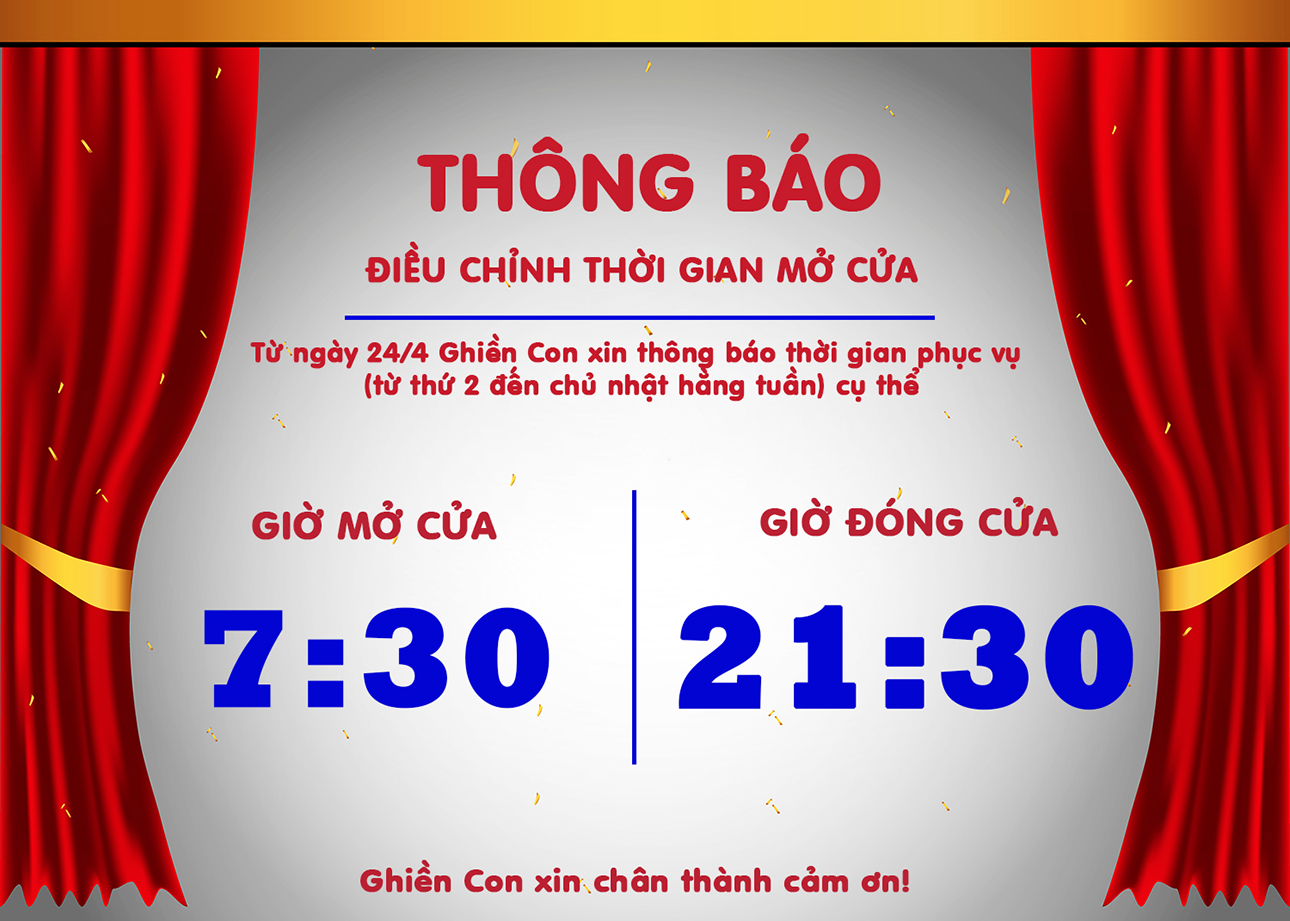 Nhằm nâng cao chất lượng dịch vụ khách hàng, Ghiền Con xin thông báo điều chỉnh thời gian phục vụ đến bố mẹ.